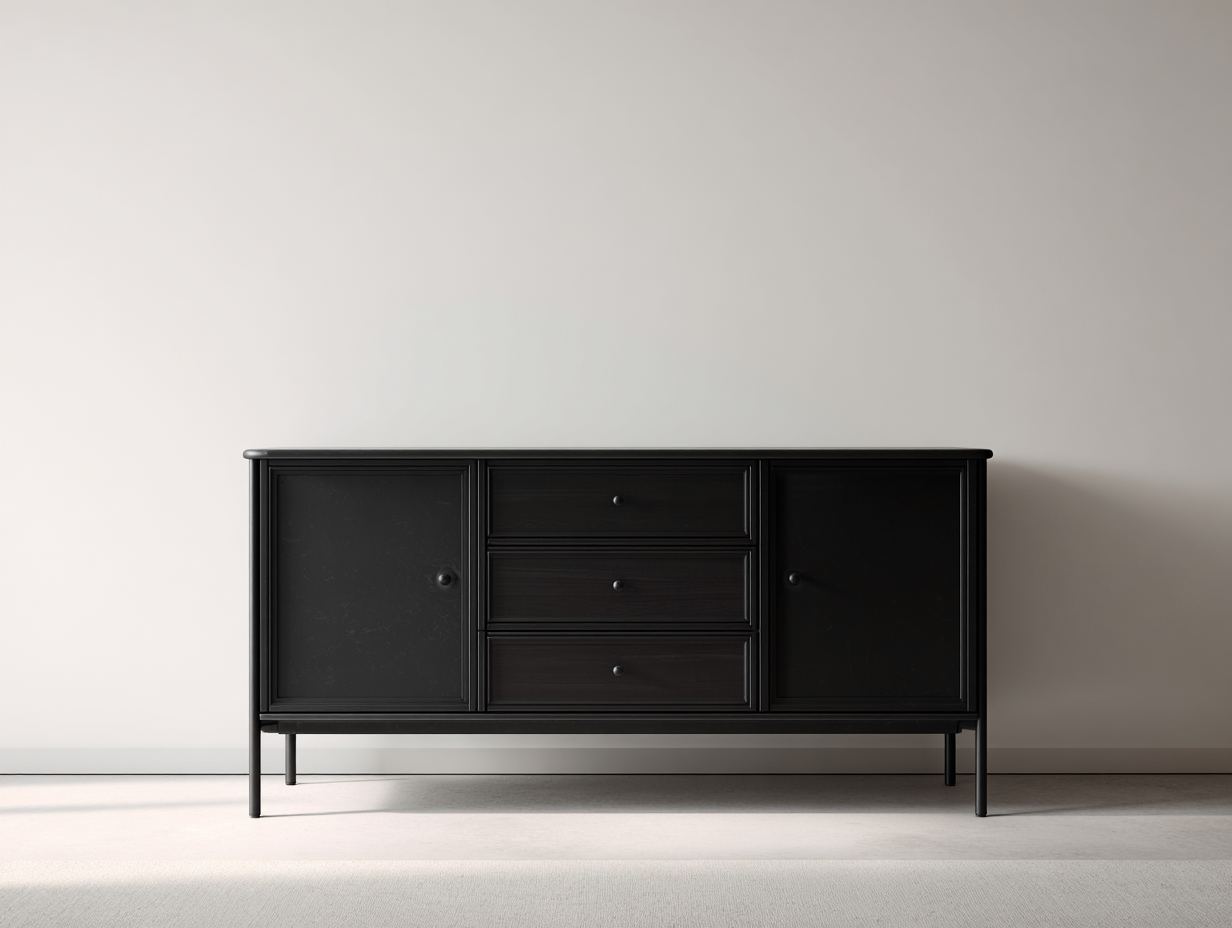 Der Schrank wird aus Holz und Metall gefertigt und zeichnet sich durch eine stabile Konstruktion aus. Die schwarze Oberfläche sorgt für eine elegante Erscheinung und bringt die natürliche Struktur des Holzes dezent zur Geltung. Metallfüße ergänzen das Design und bieten eine solide Basis für den täglichen Gebrauch.