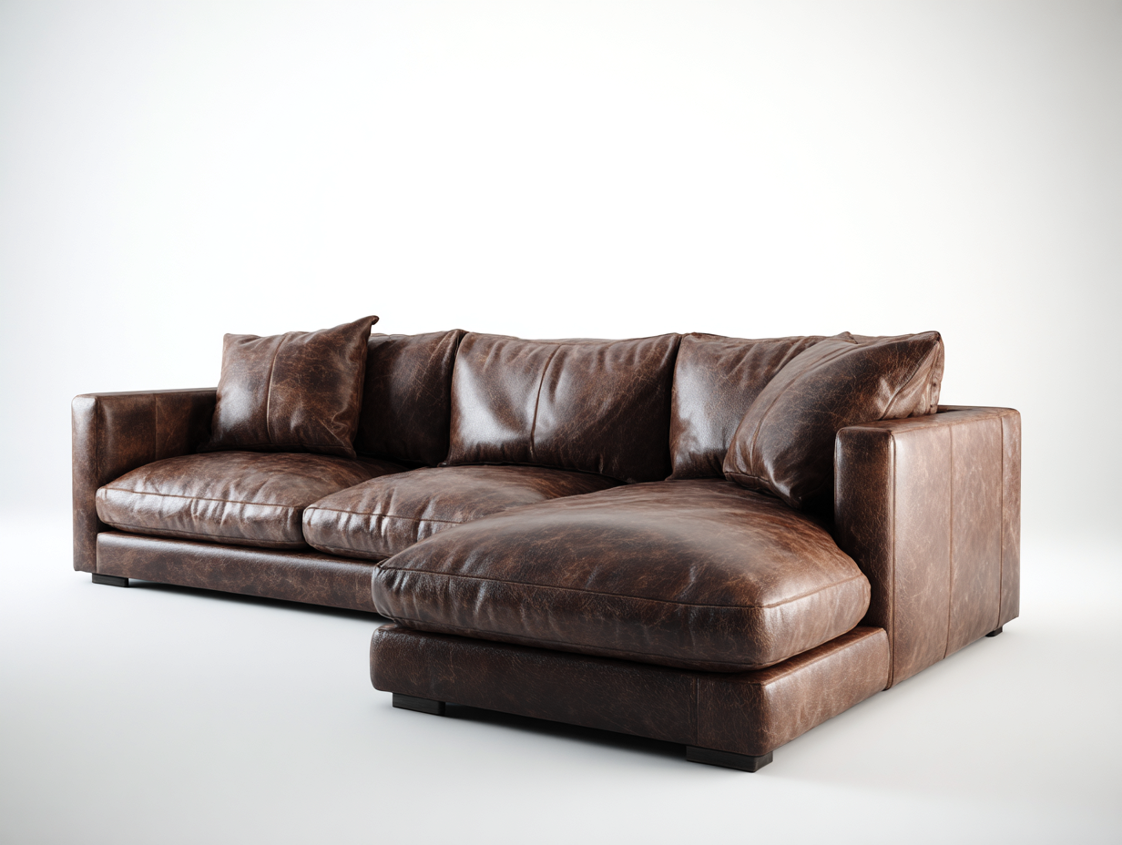 Das Ecksofa ist mit Leder in Dunkelbraun bezogen und zeichnet sich durch eine glatte, leicht strukturierte Oberfläche aus. Die Polsterung sorgt für eine gleichmäßige Sitzfläche und ein angenehmes Sitzgefühl. Die stabile Grundkonstruktion unterstützt eine zuverlässige Nutzung im täglichen Gebrauch.